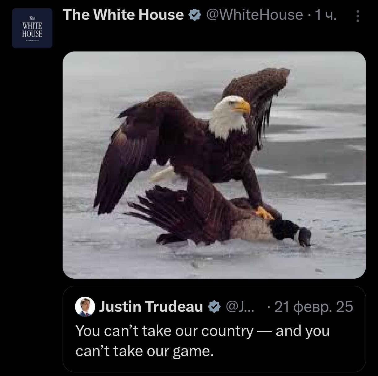 Так Білий дім відповів на посаду колишнього прем'єр-міністра Канади Джастіна Трюдо, який після перемоги канадців над американцями у фіналі Турніру чотирьох націй 2025 року написав: "Вам не відібрати нашу країну - і не відібрати нашу гру".