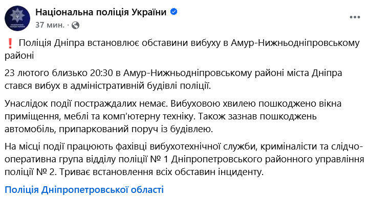 Пізніше в Нацполіції опублікували подробиці вибуху в одному з поліцейських відділень Дніпра.