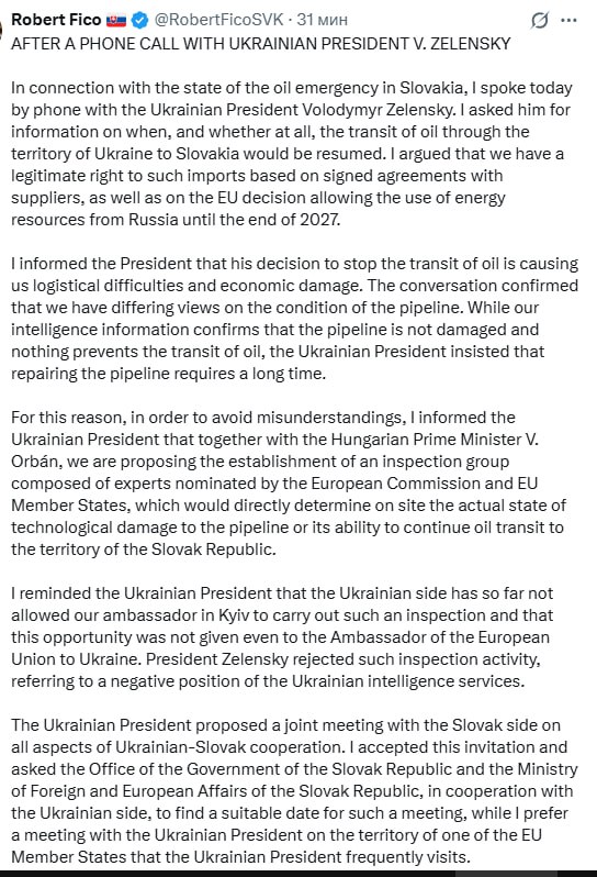 "Президент України запропонував провести спільну зустріч зі словацькою стороною за всіма аспектами українсько-словацького співробітництва. Я прийняв це запрошення і попросив Канцелярію уряду Словацької Республіки та Міністерство закордонних справ та європейських справ Словацької Республіки у співпраці з українською стороною знайти відповідну дату для такої зустрічі, при цьому я прийде на зустріч з Україною. держав-членів ЄС, які президент України часто відвідує”, – написав Фіцо у Х.