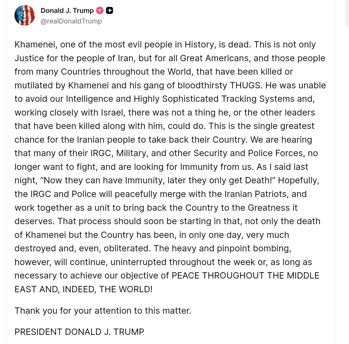 Пізніше Трамп офіційно оголосив про смерть аятоли Ірану.