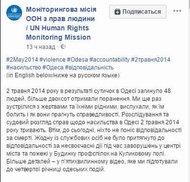"2 мая 2014 года в результате столкновений в Одессе погибли 48 человек, более двухсот были ранены. Мы вновь встретились с жертвами и их семьями, выслушали их боль и желание справедливости. Расследования и судебное рассмотрение дел о насилии в Одессе 2 мая 2014 года продолжаются. До сегодняшнего дня никто не понес ответственности за смерть людей. Никто из должностных лиц не привлечен к ответственности за несвоевременные действия по время беспорядков в центре города и пожара в Доме профсоюзов на Куликовом поле. Больше деталей - в пятиминутном видео, которое мы подготовили к четвертой годовщине одесских событий", - говорится в сообщении Миссии ООН в Facebook.