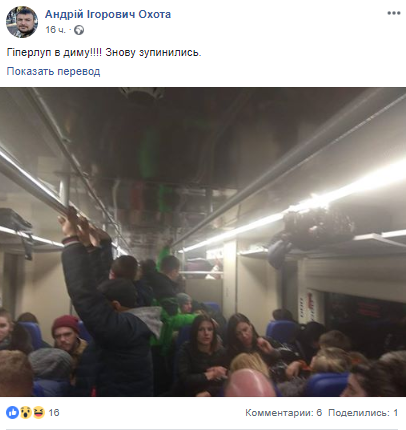 О сегодняшнем случае сообщил в Facebook пассажир поезда Андрей Охота. По его словам, поезд по пути из аэропорта в Киев остановился спустя 20 минут после начала движения.