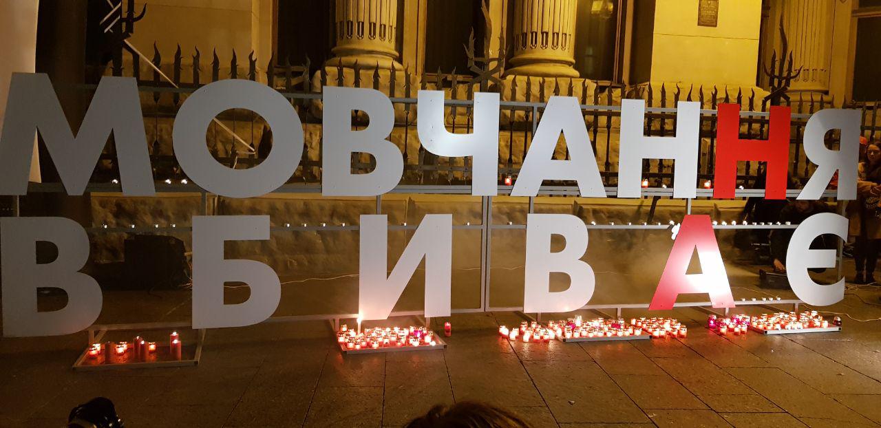 Также на экране транслировался небольшой ролик - хронология события происшествия с Катей Гандзюк. В то же время рядом с экраном установили металлическую конструкцию с надписью "Молчание убивает". Под металлоконструкцией "Молчание убивает" участники акции "Год без Кати" установили памятные лампады.