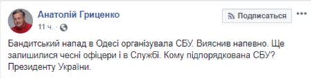 "Бандитское нападение в Одессе организовала СБУ. Выяснил наверняка. Еще остались честные офицеры и в службе. Кому подчинена СБУ? Президенту Украины", – написал он в Facebook.
